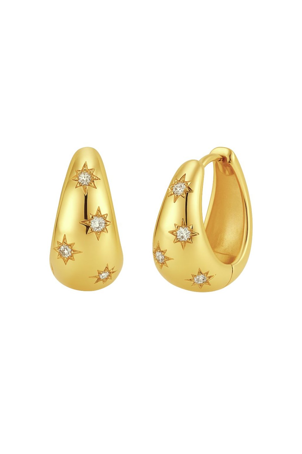 Hvězdy, které nikdy nezhasnou – tyto elegantní huggies náušnice zdobí ryté hvězdičky s jemnými třpytivými kamínky, zasazené jen z jedné strany.