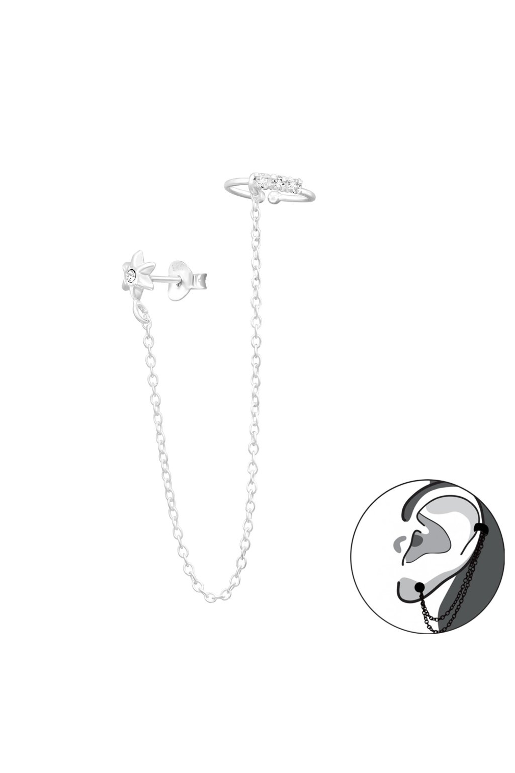 Stříbrná puzetová náušnice se záušnicí a řetízkem s hvězdičkou a zirkony