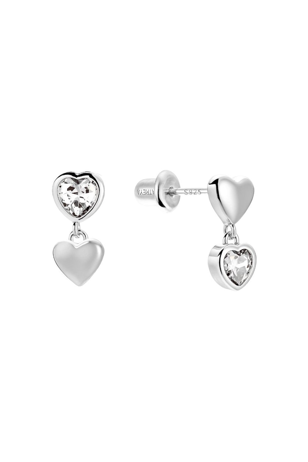 Dva srdíčkové motivy, jeden pár – ale žádná nuda. Tyto hravě asymetrické náušnice kombinují hladké a třpytivé provedení tak, že u jedné náušnice je kamínkové srdíčko nahoře a hladké visí pod ním, zatímco u druhé je to naopak. Elegantní detail, kterého si všimnete na druhý pohled – a zamilujete si ho napořád.